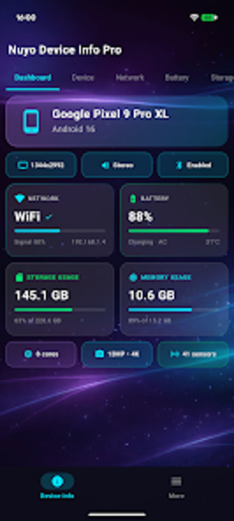 Nuyo Device Info Pro is een veelzijdige applicatie voor Android die uitgebreide systeeminformatie biedt voor smartphones, tablets en Android TV. Met deze tool kunnen gebruikers de ware sensorresolutie van hun camera's bekijken, de ondersteuning voor HDR en Dolby Atmos verifiëren, en gedetailleerde hardware-specificaties inzien. De app is gratis te gebruiken en vereist geen account, wat de toegankelijkheid vergroot. De interface biedt een dashboard met belangrijke statistieken en een widget voor het startscherm, waardoor gebruikers snel en eenvoudig toegang hebben tot hun apparaatinformatie.
